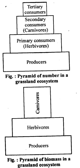 Ans: Ecological pyramid is a graphical method to show the number of organisms or biomass or amount of energy present at different trophic levels. Pyramid of number: Number of individuals at each trophic level is shown in pyramid. The pyramid of number (for example of a grassland) is upright. In this there is a decrease in the number of organisms starting from primary producers (plants) to top consumers (carnivores). Pyramid of biomass : Pyramid of biomass is graphic representation of amount of biomass per unit area sequence wise in rising trophic levels with producers at the base and top carnivores at the apex. Pyramids of biomass of a tree or . grassland ecosystem are upright and the pyramid of a pond ecosystem is inverted.